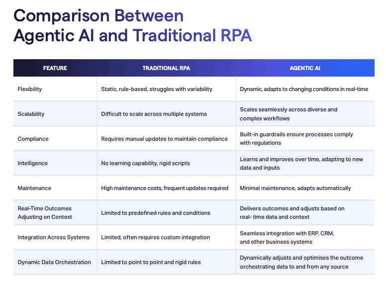 The key architectural difference: RPA says "do these steps exactly." Agentic AI says "achieve this goal however you can."